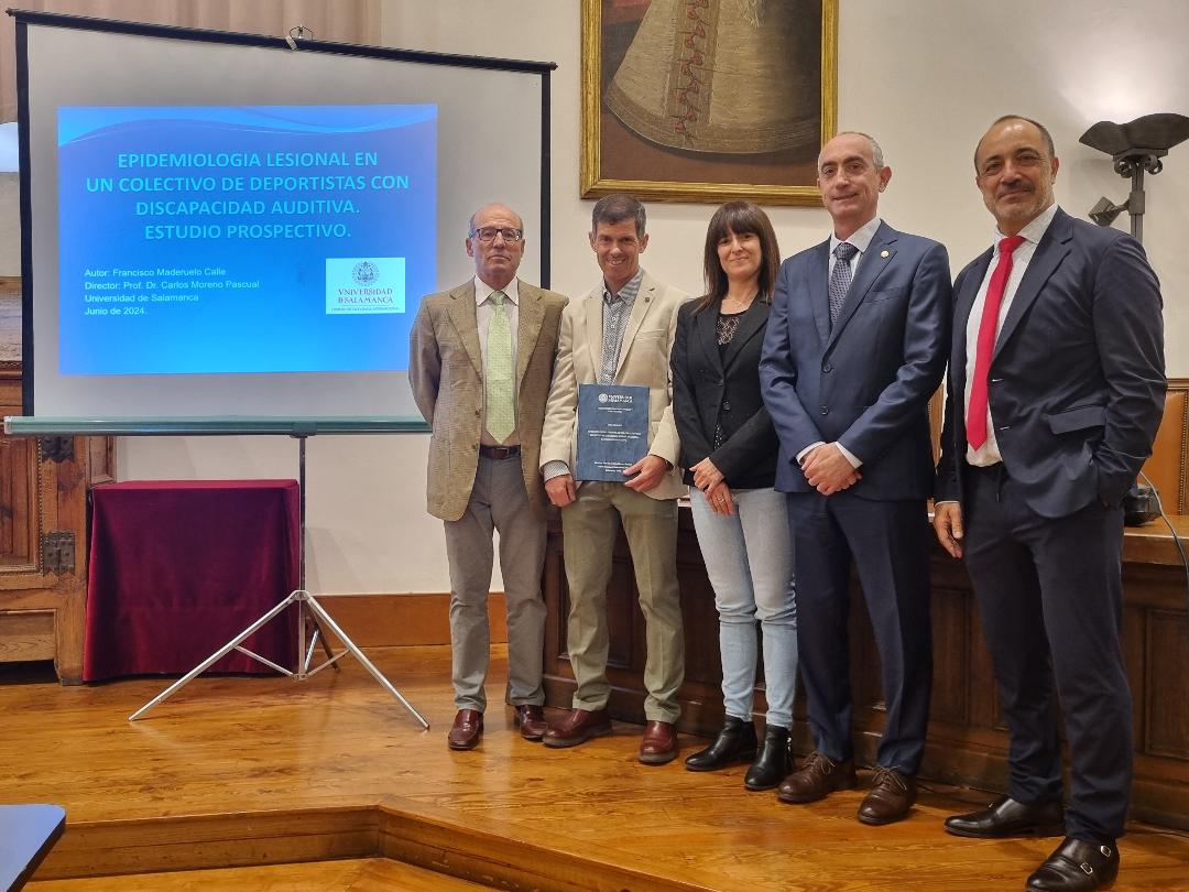 El pasado 20 de junio Francisco Maderuelo Calle, antiguo atleta de nivel internacional de la FEDS (Federación española de deportes para sordos) y fisioterapeuta titular del Hospital General de Segovia, superó la defensa de su doctorado en el edificio histórico de la prestigiosa Universidad de Salamanca, logrando un sobresaliente Cum Laude por su tesis sobre “Epidemiología lesional en un colectivo de deportistas con discapacidad auditiva. Estudio prospectivo.”