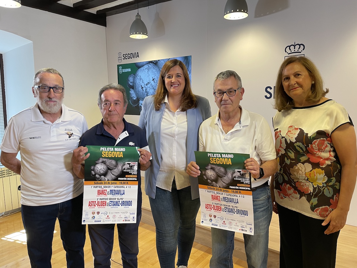 La alcaldesa en funciones, Clara Martín, y la concejala en funciones, Marian Rueda, con los organizadores del Festival de Pelota a Mano que tendrá lugar el sábado 24 de junio, a las 19.00 horas, en el Frontón Segovia, organizado por el Club Manomanista Skurfers.