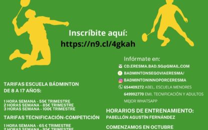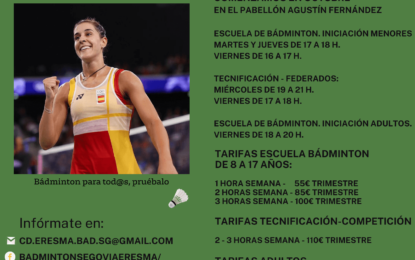 Vuelve el bádminton En el CD Bádminton Innoporc Eresma tenemos hueco para todos y todas. – Escuela infantil, para menores de 17 años. – Grupo de tecnificación para los que quieren...Ene 22, 2025 IMDSG Destacada, Otras noticias 0