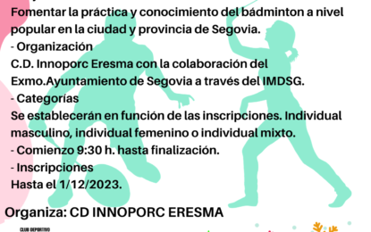 Ya tenemos abiertas las inscripciones de bádminton para la temporada 2024/25 En el CD Bádminton Innoporc Eresma tenemos hueco para todos y todas. Escuela infantil, para menores de 17 años. Grupo...Jun 14, 2024 IMDSG Destacada, Otras noticias 0