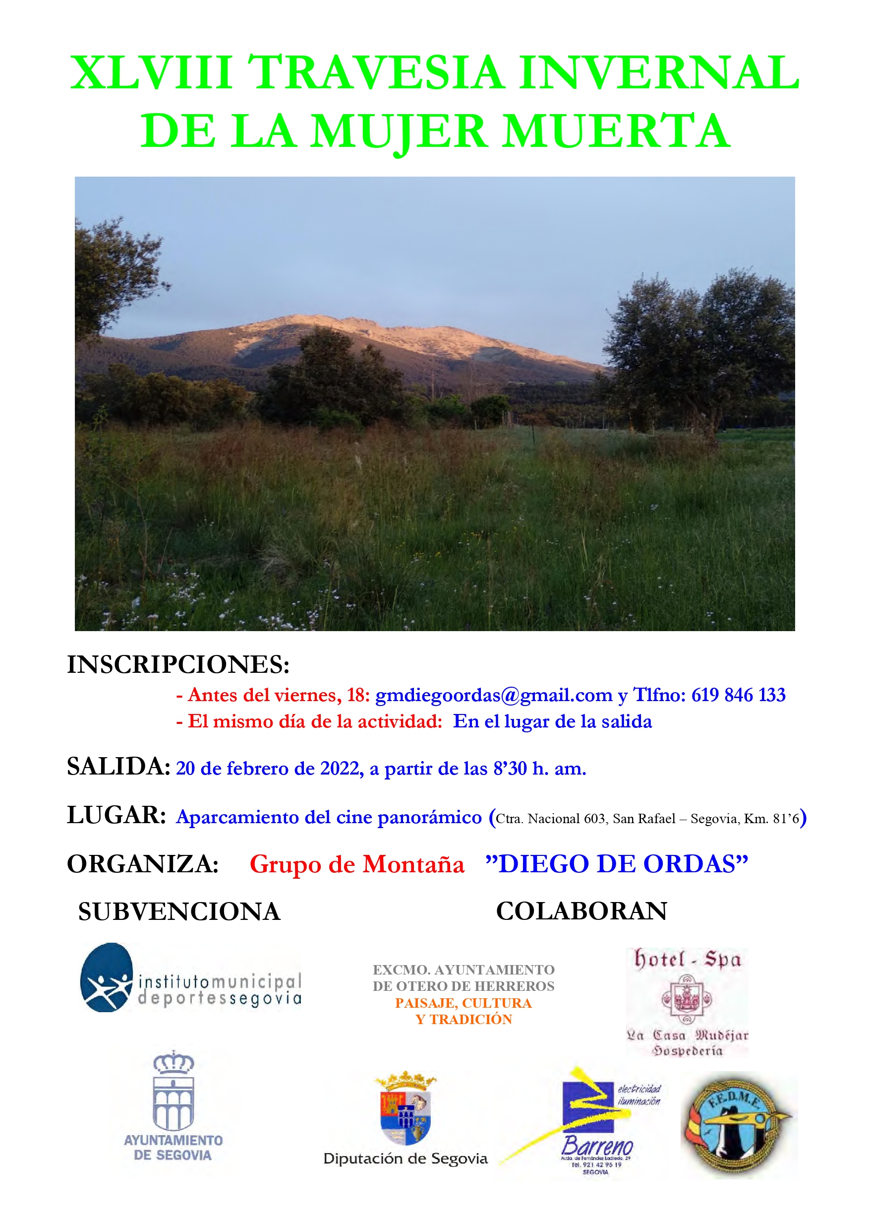 .- La inscripción que es gratuita, se puede hacer a través de correo-e a la dirección gmdiegoordas@gmail.com o en la salida, siendo necesario que los montañeros estén federados en montaña, al menos con la licencia tipo B, vigente en 2022, debiendo presentarla a la salida.